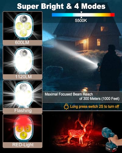 Versatile Lighting Modes: Whether you need low brightness for close tasks or high brightness for expansive visibility, the spotlight features four distinct modes—Low Brightness (600LM), High Brightness (1120LM), Flashing, and Red-Light mode.