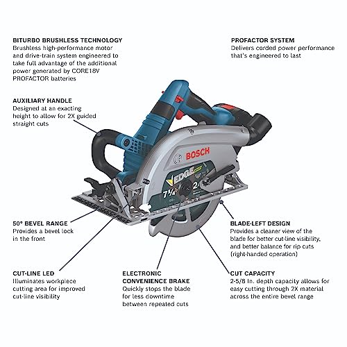 The Bosch GKS18V-26LB14-RT stands at the intersection of innovation and performance, bringing professional-grade capabilities to your toolkit. As a cordless 7-1/4 inch circular saw that mimics the power of corded models, this tool is designed for serious woodworkers and contractors alike. With its lightweight design combined with cutting-edge features like the BITURBO Brushless Technology and electronic conveniences, it’s poised to tackle even the most demanding tasks efficiently.