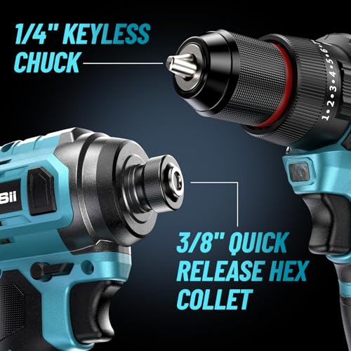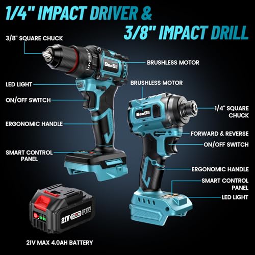 The SEESII 21V Max Cordless Drill and Impact Driver combo kit is designed for both seasoned professionals and DIY enthusiasts alike. This powerful kit comes with a 1/4" impact driver and a 3/8" drill, both equipped with advanced brushless motors that elevate performance while minimizing energy loss and noise. With features tailored for versatility and efficiency, this combo kit promises to meet a wide range of home improvement and automotive needs.