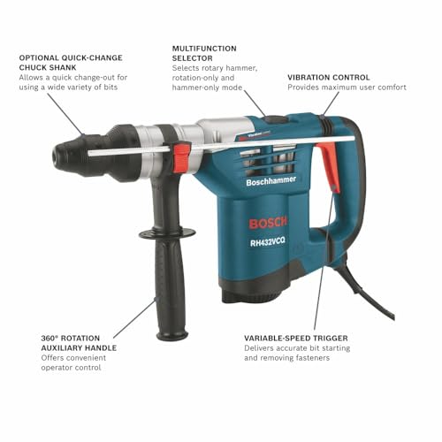 The Bosch RH432VCQ SDS-plus® 1-1/4 In. Rotary Hammer with Quick-Change Chuck System is a powerful tool designed for professionals and DIY enthusiasts alike. With its robust 8.5-amp motor delivering an impressive 3.1 ft-lbs of impact energy, this rotary hammer ensures you achieve professional results every time. Its user-centric features, including vibration control and a lightweight design, make it suitable for extended periods of work, handling various tasks with ease.